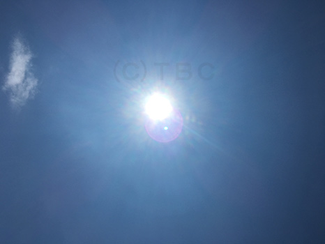 鉄塔の真上に太陽。雲は多くても、明らかに太陽の存在が確認できる。
