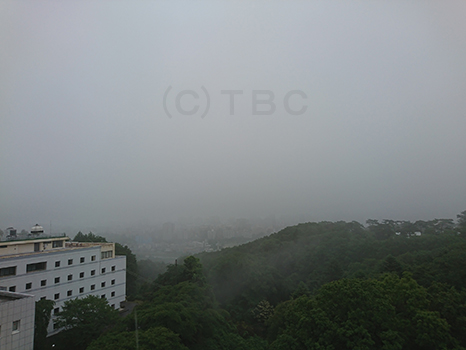 弱い雨が降り続き、市街地も霞んでいる。気温はさほど高くはないが、湿気が多く、ややムシムシする。