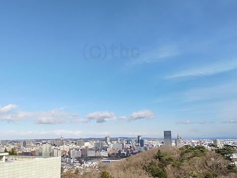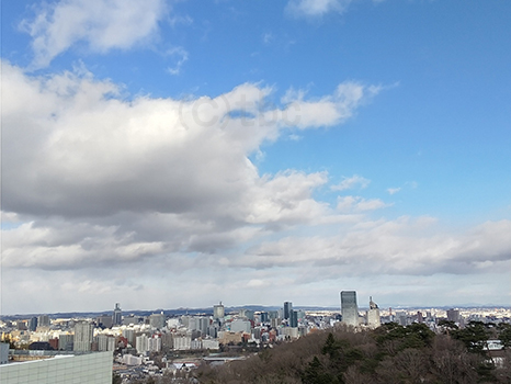 昼過ぎの仙台市内。東の方向に少し青空も見え、明るい曇り空。